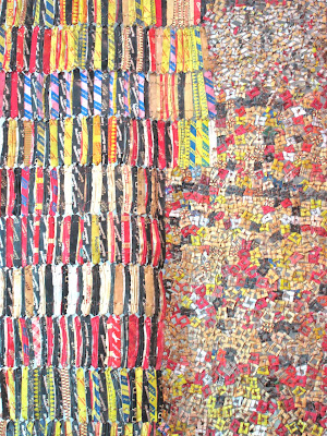 Yesterday I went to the Clark Museum in Williamstown, MA to see an astounding, gorgeous show of work by African artist El Anatsui. Born in Ghana, he's worked in Nigeria for the past 25 years or so, a professor of sculpture at the University of Nigeria. The works were large sculptural wall hangings made entirely of discarded aluminum tops from liquor bottles, pieced together with copper wire.